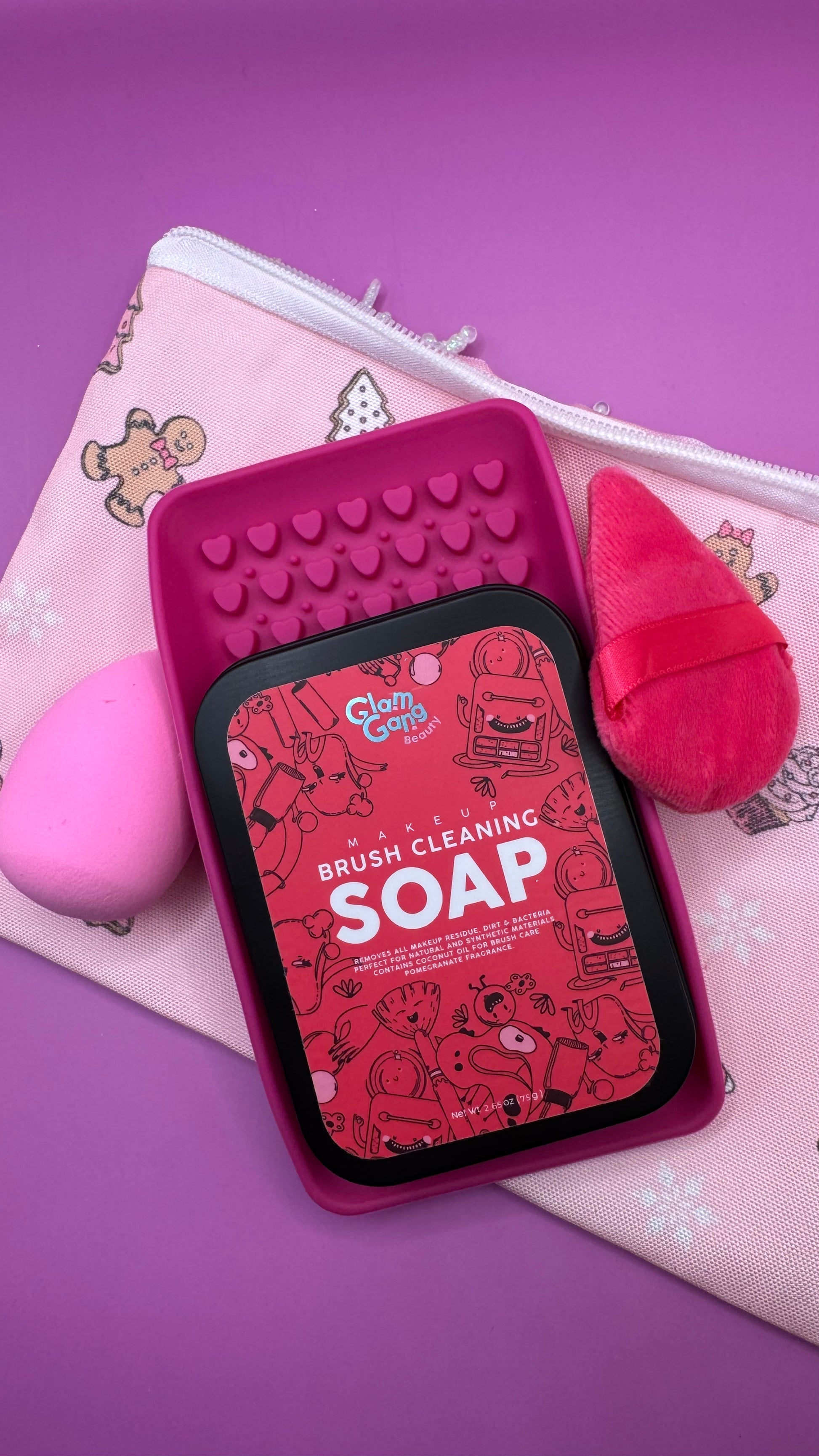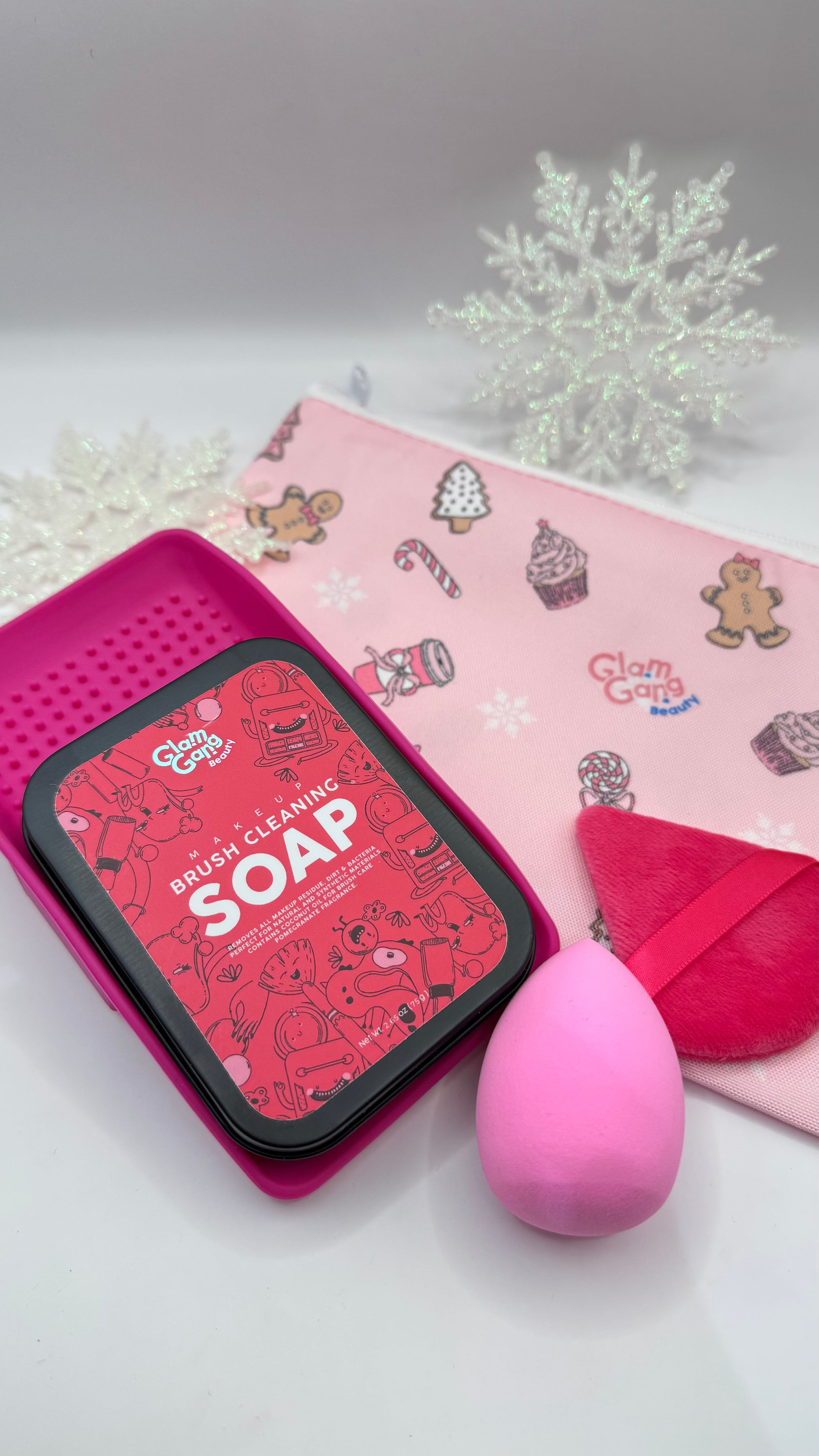 Inside: our star product Glam Gang soap, a scrubbing pad, a blender makeup sponge, and a powder puff to finish it all off. It's the gift that keeps on giving.